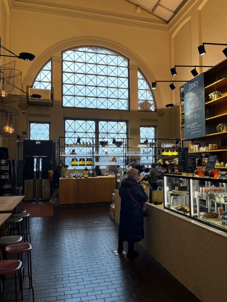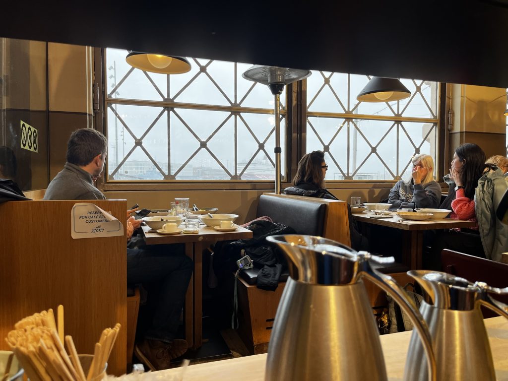 Es sieht überall fantastisch aus und mit viel Hunger sollte man hier nicht reingehen. Es duftet verheißungsvoll und man muss nur noch den Stand der Wahl aussuchen, denn die Suppe gibt’s fast an jedem Stand. Am Ende habe ich sie bei dem Stand „Story“ in der Mitte der Halle genossen, da es dort Fensterplätze gibt mit Blick auf den Hafen. Während des Essens hat sich das Wetter draußen richtig zugezogen. Man kann kaum quer über das Hafenbecken schauen und es wird nochmal deutlich kälter und es fängt in Strömen an zu regnen. Also noch eine Kaffee in der Markthalle und dann direkt zum Bahnhof 😊🚃