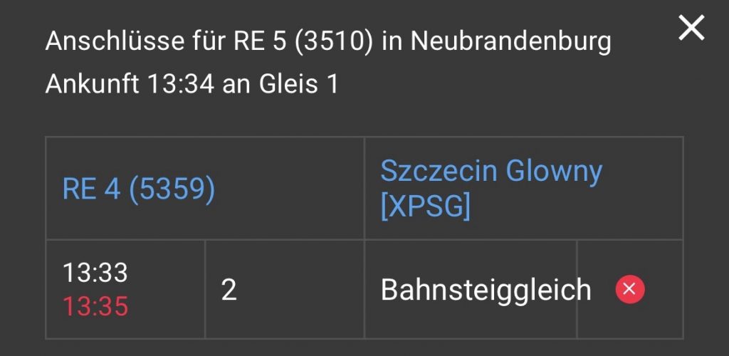 Der erste Zug nach Neubrandenburg glänzt gleich mit 5 Minuten Verspätung. Mal sehen, ob es mit dem Umstieg in zwei Minuten am gleichen Bahnsteig gegenüber klappen wird.