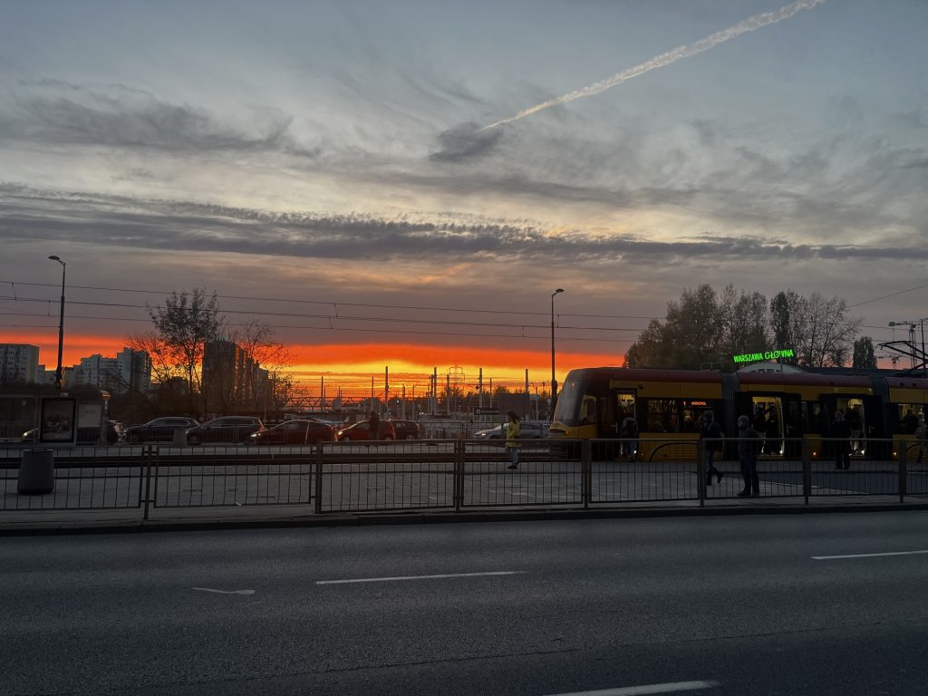 Kaum bin ich mit der Straßenbahn zurück am Hotel taucht der Sonnenuntergang die Bahnanlagen des Bahnhofs Warszawa Glowna – der trotz des Zusatzes „Glowna“ – „Hauptbahnhof“ nur noch ein Regionalbahnhof ist – in ein hübsches Abendlicht.