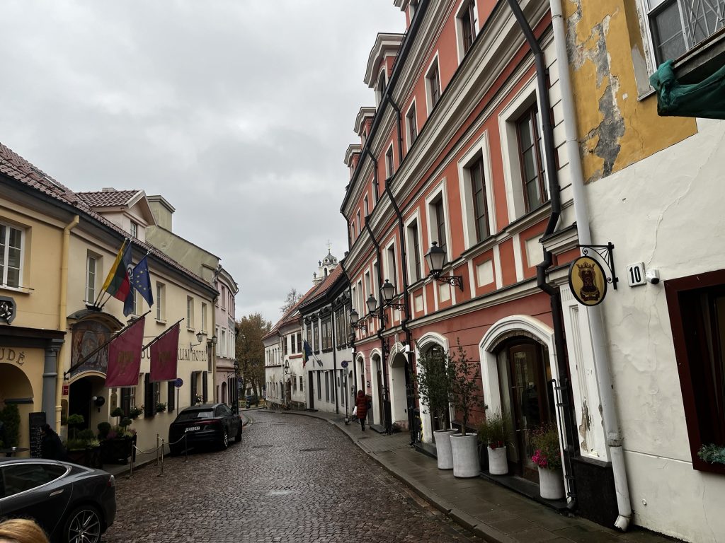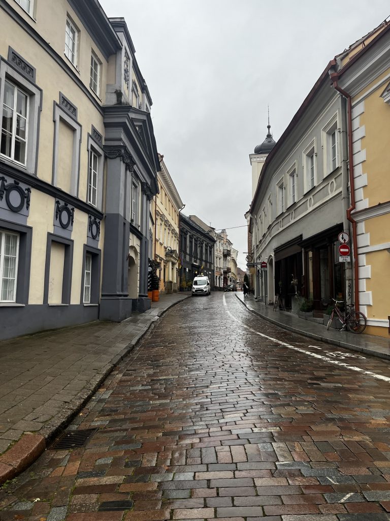 Den Platz neben der Kathedrale verlassen wir nach einer ausführlichen geschichtlichen und architektonischen Erläuterung. Der Glockenturm heißt bei den Litauern „Sandwich Turm“ wegen der drei (bzw. inkl Keller vier) Architekur Stile. Keller und Erdgeschoss stammen noch von dem Verteidigungsturm der unteren Burg aus der zweiten Hälfte des 14. Jahrhunderts. Im 15. Jahrhundert wurde der Turm um ein achteckiges Geschoss im gotischen Stil erhöht. Im 16. Jahrhundert wurde er schließlich um zwei weitere Geschosse im Stil des Barock erhöht.