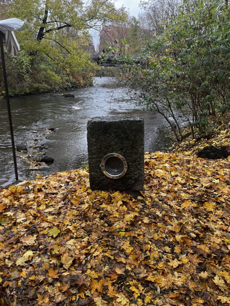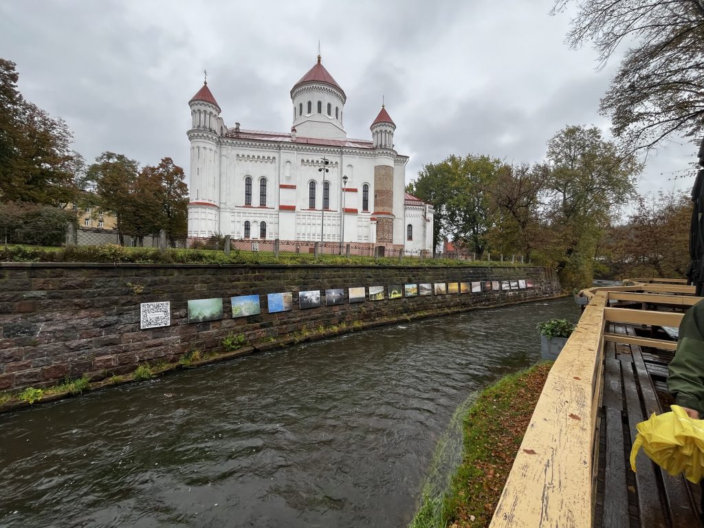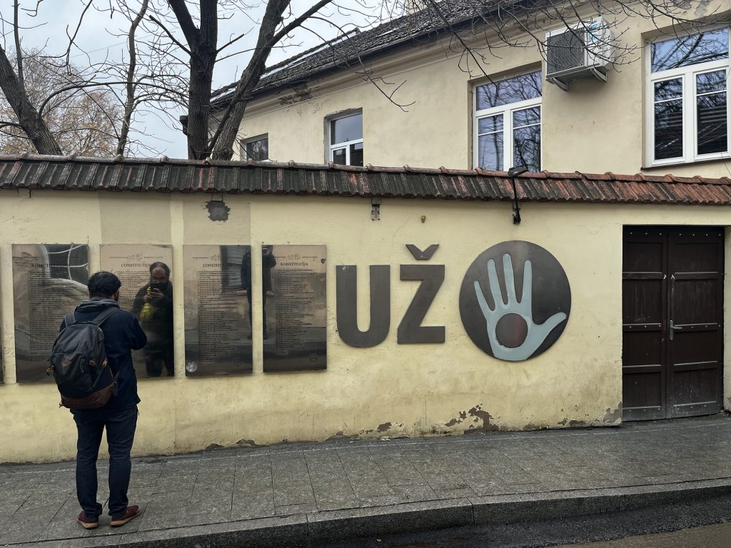 Den Berg hinunter und über die Brücke der Vilnelė (Wilna) – dem Namensgebenden Fluss in Vilnius – kommen wir in die Republik Užupis. Ursprünglich haben sich hier viele Künstler, Aussteiger der Gesellschaft und andere alternativ denkende und lebende Menschen angesiedelt. Heute ist hier immer noch viel Kunst und alternatives Leben – alles unter der Verfassung, die in 45 Sprachen auf Tafeln an der Straße aufgeschrieben steht.