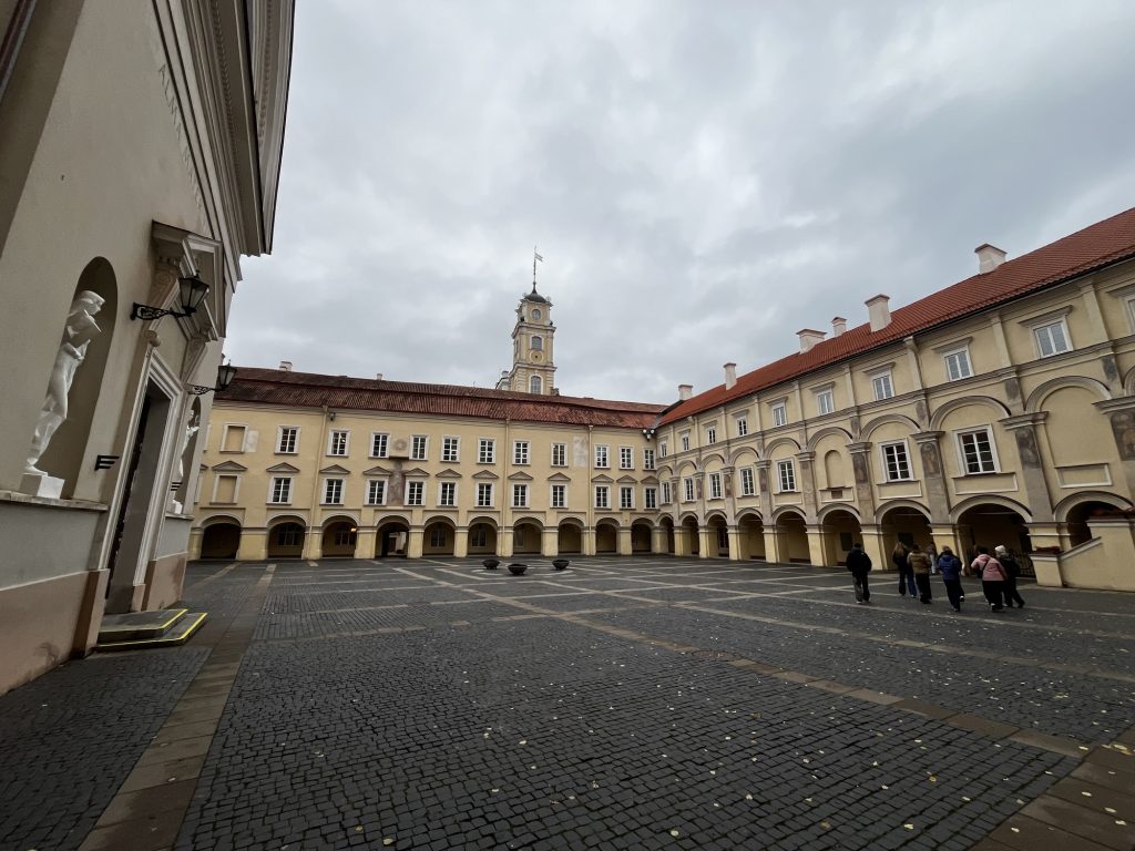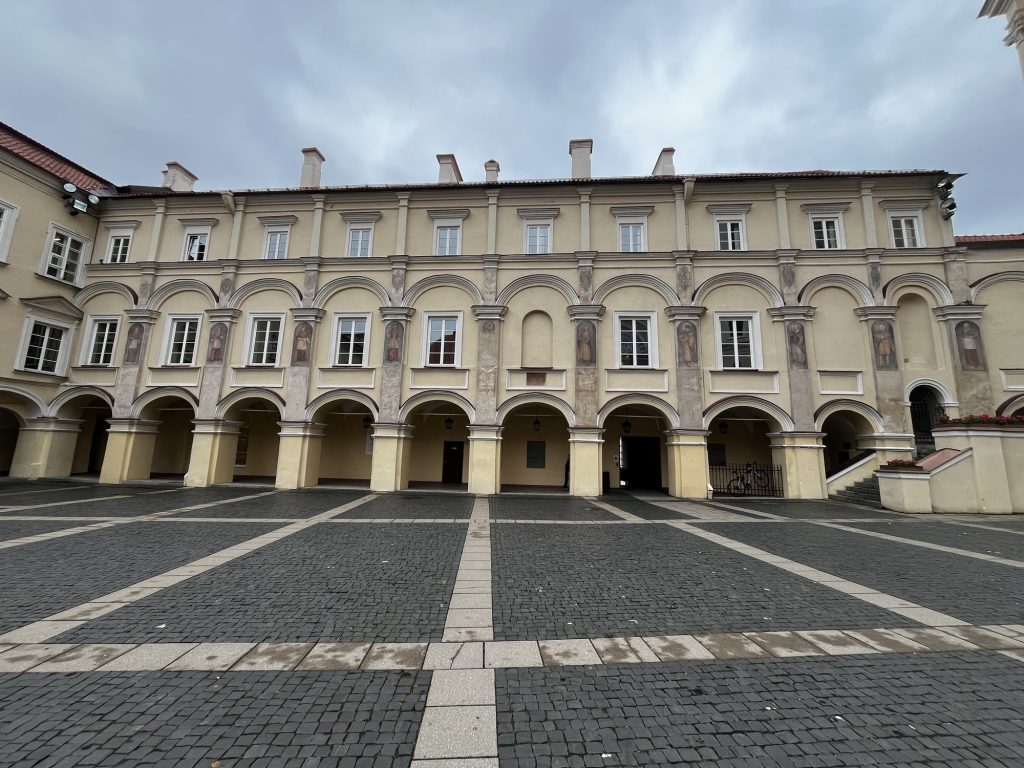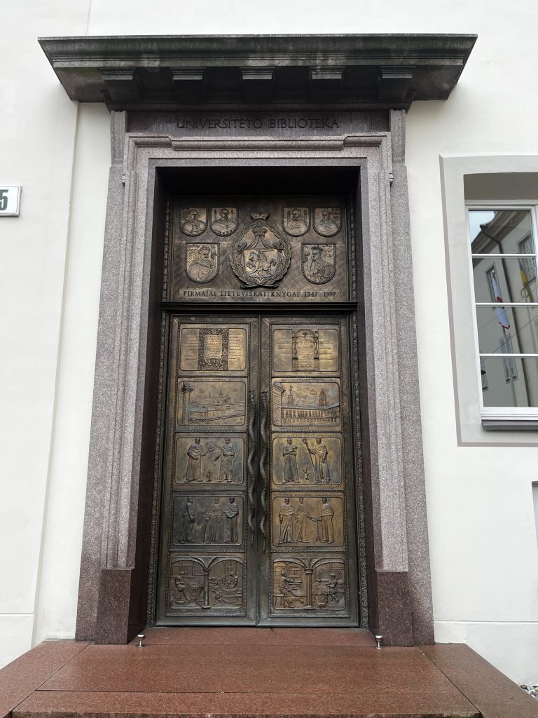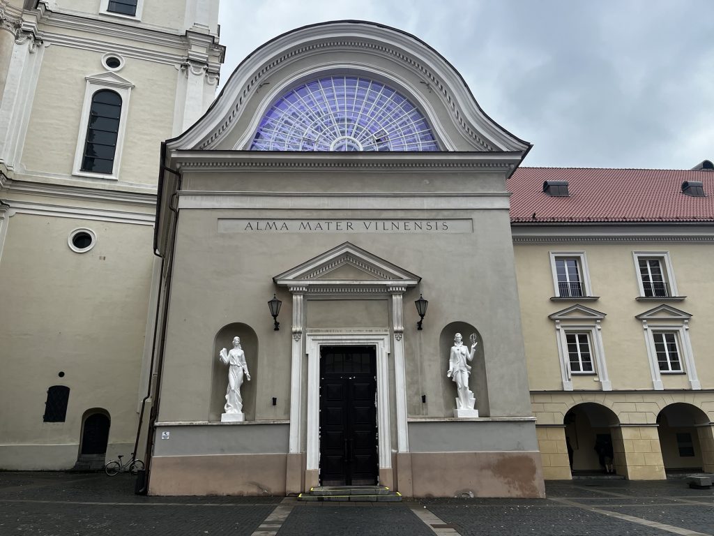Dann wieder zurück in die Altstadt zur Universität, die eine ebenso wechselvolle Geschichte wie alle kirchlichen und sonstigen Institutionen in Vilnius hat. Hier besonders das kleine Museum, das man durch die Kathedrale betritt. Diese zeugt auch ihr von der Zugehörigkeit und dem Wirken der Jesuiten in Vilnius. Ich entdecke dort einen Hinweis auf den „Franciszek Smuglewicz Hal“ Lesesaal der Universitätsbibliothek, den ich mir sehr gerne ansehen würde: Aber als ich am Eingang ankommen, ist geschlossen und wird auch erst Montag wieder geöffnet. Also beim nächsten Besuch von Vlnius einplanen. Wenn man mehr von der Bibliothek sehen möchte, am besten zu einer Tour anmelden.